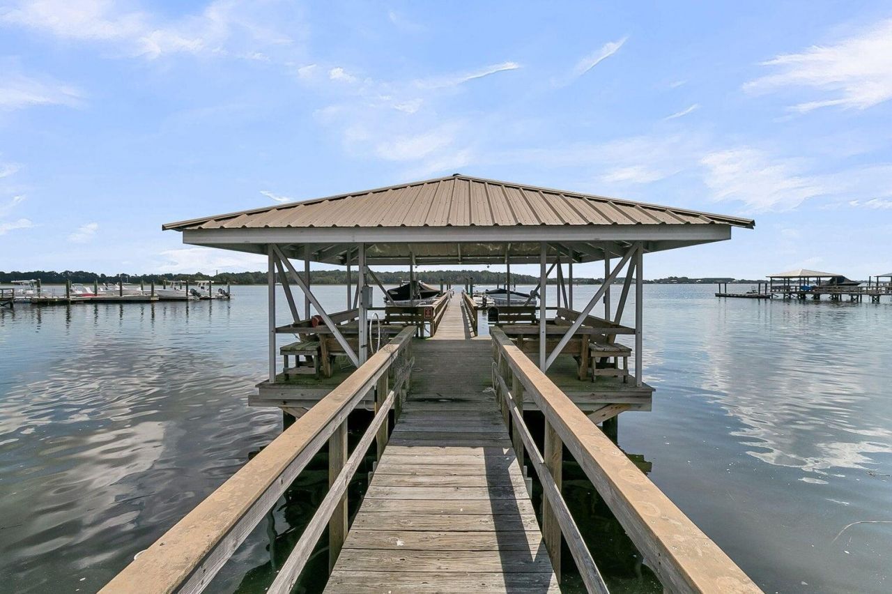 Set within a private gated Charleston community along the Wando River, this five bedroom, three and a half bath home offers over 3,300 square feet paired with a true Lowcountry lifestyle, complete with a neighborhood dock and deep water access.Classic double front porches create a warm first impression and invite coastal breezes. Inside, the open and inviting floor plan is anchored by a vaulted great room with views of the natural landscape.The main floor primary suite is thoughtfully positioned, offering a spacious sitting area and a sense of privacy. Upstairs, four additional bedrooms and an open loft provide flexibility for family, guests, or gathering space.The interior has been carefully redesigned throughout. Wood floors run seamlessly from room to room, complemented by a fullinterior repaint that includes ceilings, doors, and trim. Designer lighting and updated LED ceiling fixtures bring a clean, elevated feel, while new hardware, faucets, and mirrors add a cohesive finish across the kitchen and baths.The kitchen is both polished and inviting, anchored by a custom shiplap island and enhanced with a newly added backsplash. A butler's pantry adds stylish, functional storage, making everyday living and entertaining feel effortless. The design connects naturally to the fireplace feature wall and mantle, creating a comfortable yet custom space. The pantry has also been fitted with custom shelving, and the laundry room has been upgraded with tile. There is also a flexible space that can serve as an office, lounge, or formal dining area depending on your needs.In the primary suite, added crown moulding finishes the space. The powder room has been fully reimagined with a new vanity, trim, and statement wallpaper. New door hardware extends throughout the home.Additional highlights include a whole home and drinking water filtration system, as well as custom bamboo shades that bring warmth and texture to each space.The exterior continues the home's appeal with freshly painted porches and a three car garage that offers ample room for storage, recreation, or a golf cart.Conveniently located near Philip Simmons schools, with easy access to Point Hope dining and shopping, as well as Mount Pleasant, Daniel Island, and Charleston's beaches, this home offers a well balanced blend of comfort, design, and location.